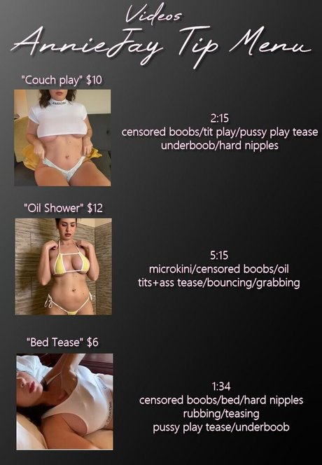 AnnieJay Short Info: The wild sex experience captured in a grassy hillside under the stars tells a story of passion without boundaries. She gets turned on snapping bathroom mirror nudes filled with slutty angles showing her pussy wide open and tits uncovered, since the thought of her pics trending here excites her every time. High definition close ups of an oil soaked anal gape shoot with toys and cum play would satisfy even the dirtiest fantasies.